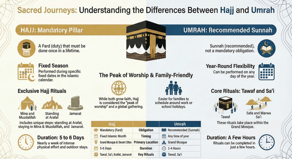 The main difference is obligation. Hajj is Fard (mandatory), which means every Muslim must perform it once in their lifetime if they are physically and financially able. Umrah is Sunnah (recommended). It is a highly rewarding act of worship, but it is not compulsory like Hajj.
