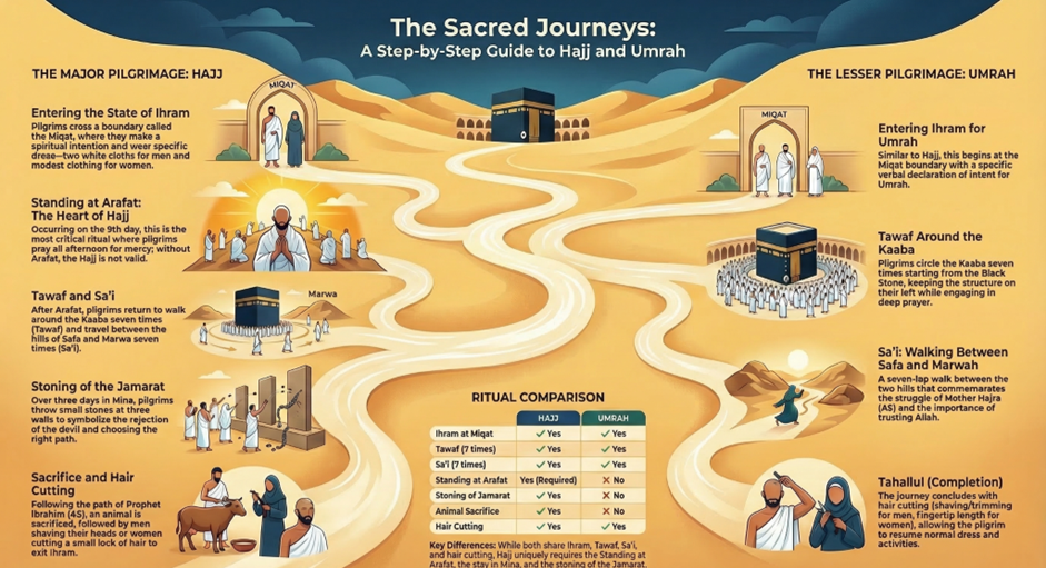 This guide provides a clear and complete comparison of Hajj and Umrah, helping you understand their meaning, differences, and spiritual significance.