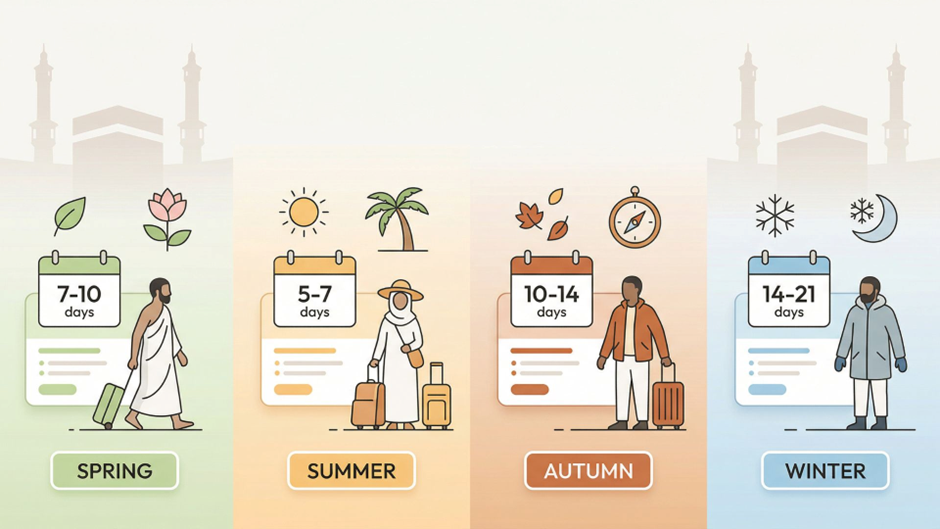 The time of year you choose has a big impact on your Umrah experience. It affects how many days you should stay in the Holy Cities. Weather conditions, school holidays, and crowd levels all play a role in shaping your journey.