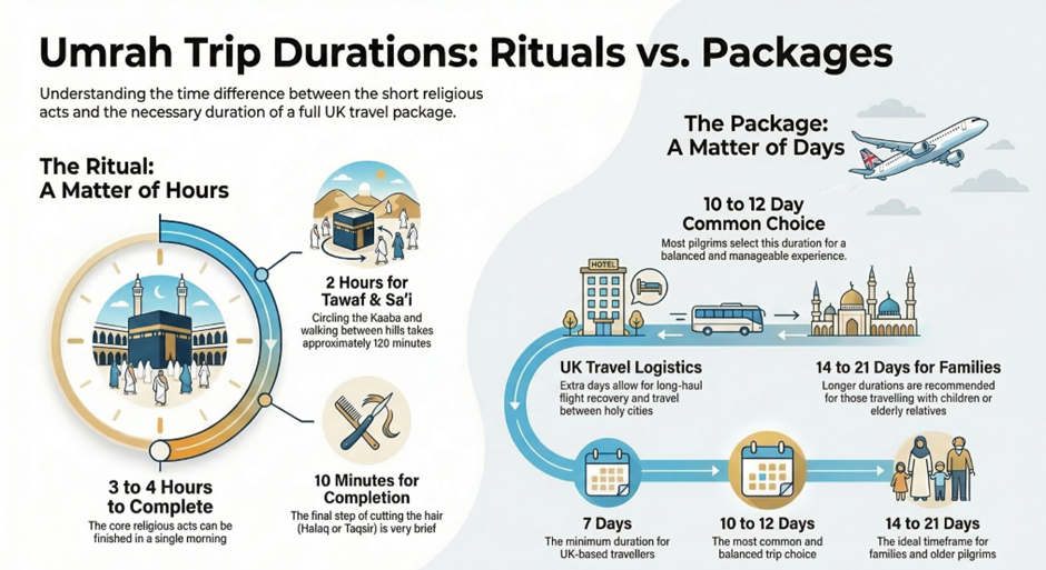 The actual religious acts of Umrah take only a few hours, which is much shorter than the full travel duration.