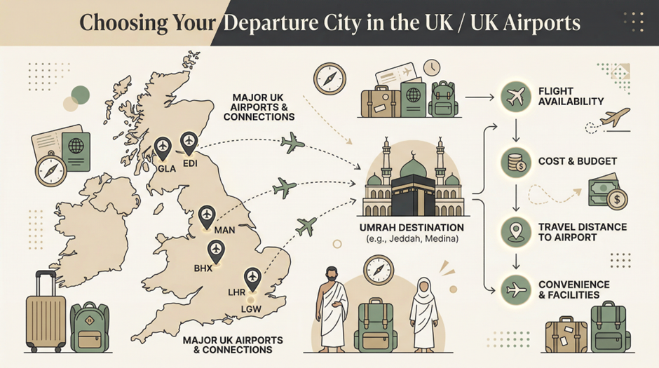 Choosing the right airport is an important step when planning your Umrah journey. A good airport option can save time, reduce stress, and offer better flight choices. Most UK pilgrims prefer major international airports because they provide direct or connecting flights to Saudi Arabia.