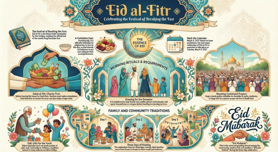 Eid al-Fitr literally translates from Arabic as the "Festival of the Breaking of the Fast." It is one of the two most important canonical religious holidays in Islam (the other being Eid al-Adha). For the dates for Ramadan 2027, Eid al-Fitr is predicted to take place on Tuesday, 9 March 2027.
