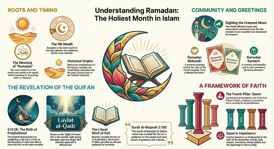 Ramadan is the 9th month of the Islamic lunar calendar, observed by Muslims worldwide as a sacred time of fasting, prayer, and spiritual reflection. As one of the Five Pillars of Islam, it requires healthy adults to abstain from all food and drink from dawn until sunset to cultivate self-discipline, gratitude, and empathy for those in need.