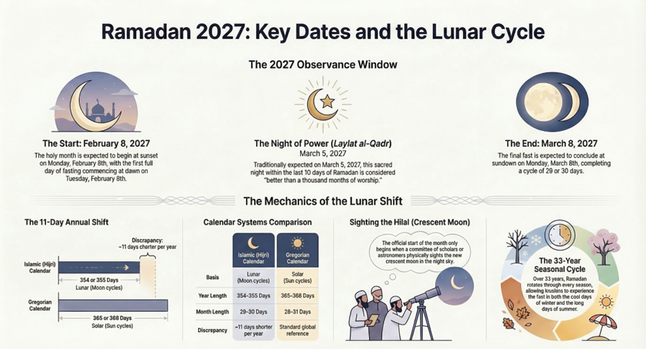- The 2027 Dates: Ramadan 2027 is expected to begin at sunset on Monday, 8 February, with the final fast occurring on Monday, 8 March.