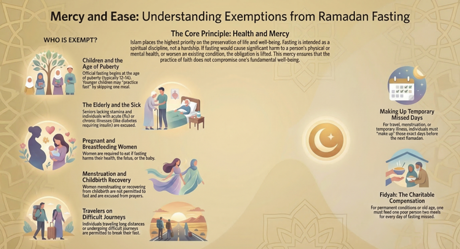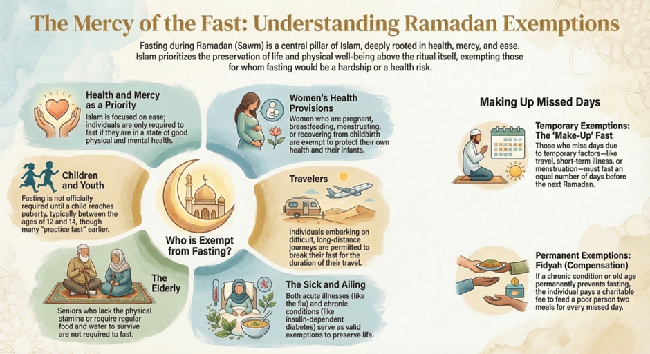 - Who is Exempt: Children, the elderly, the sick, travelers, and women who are pregnant, breastfeeding, or menstruating are not required to fast.