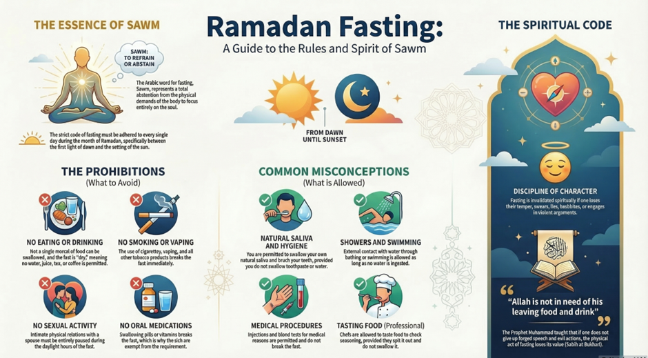 - The Fasting Rules (Sawm): Healthy adult Muslims abstain from all food, liquids (including water), smoking, and physical intimacy from dawn (Suhoor) until sunset (Iftar).